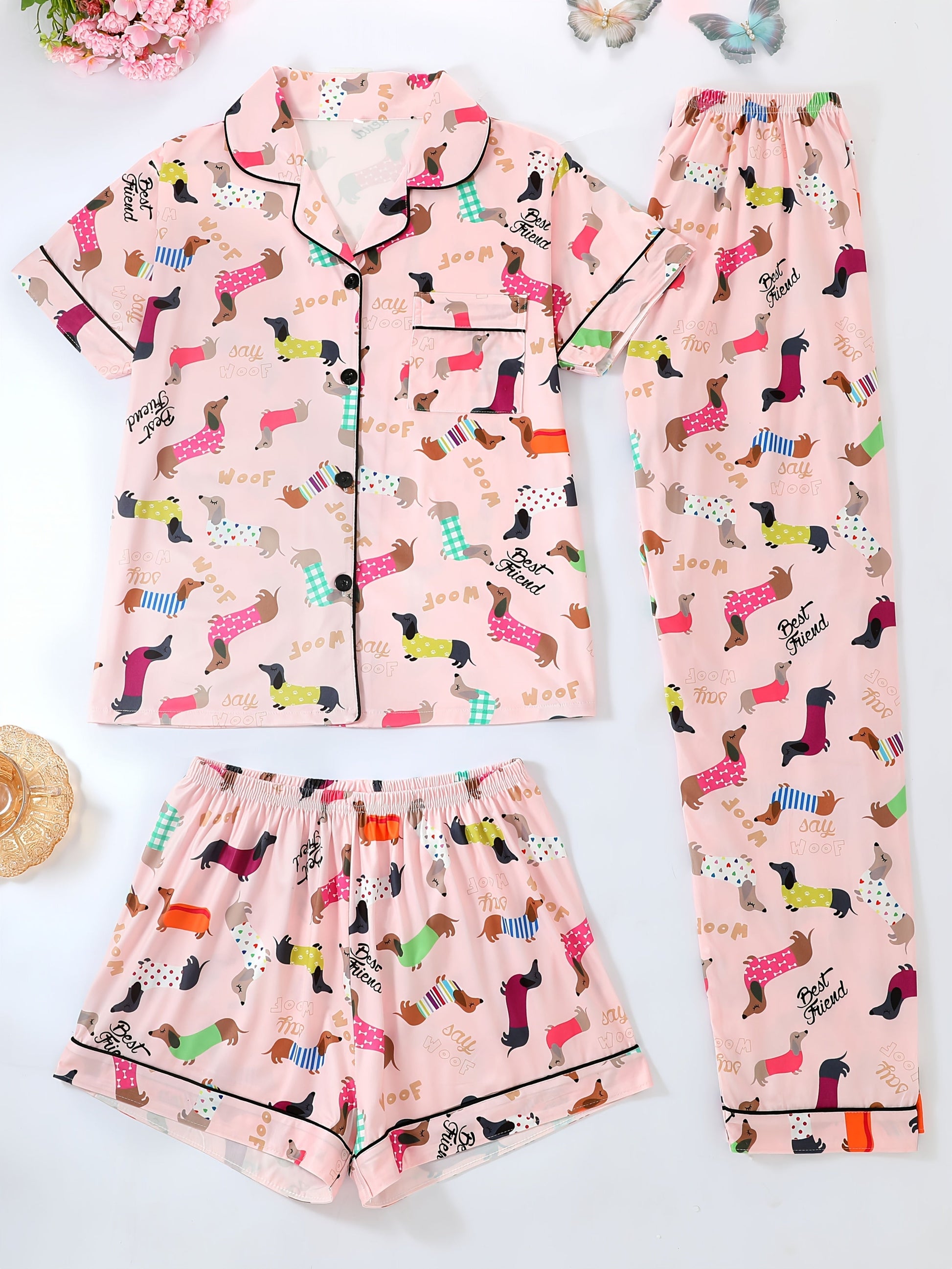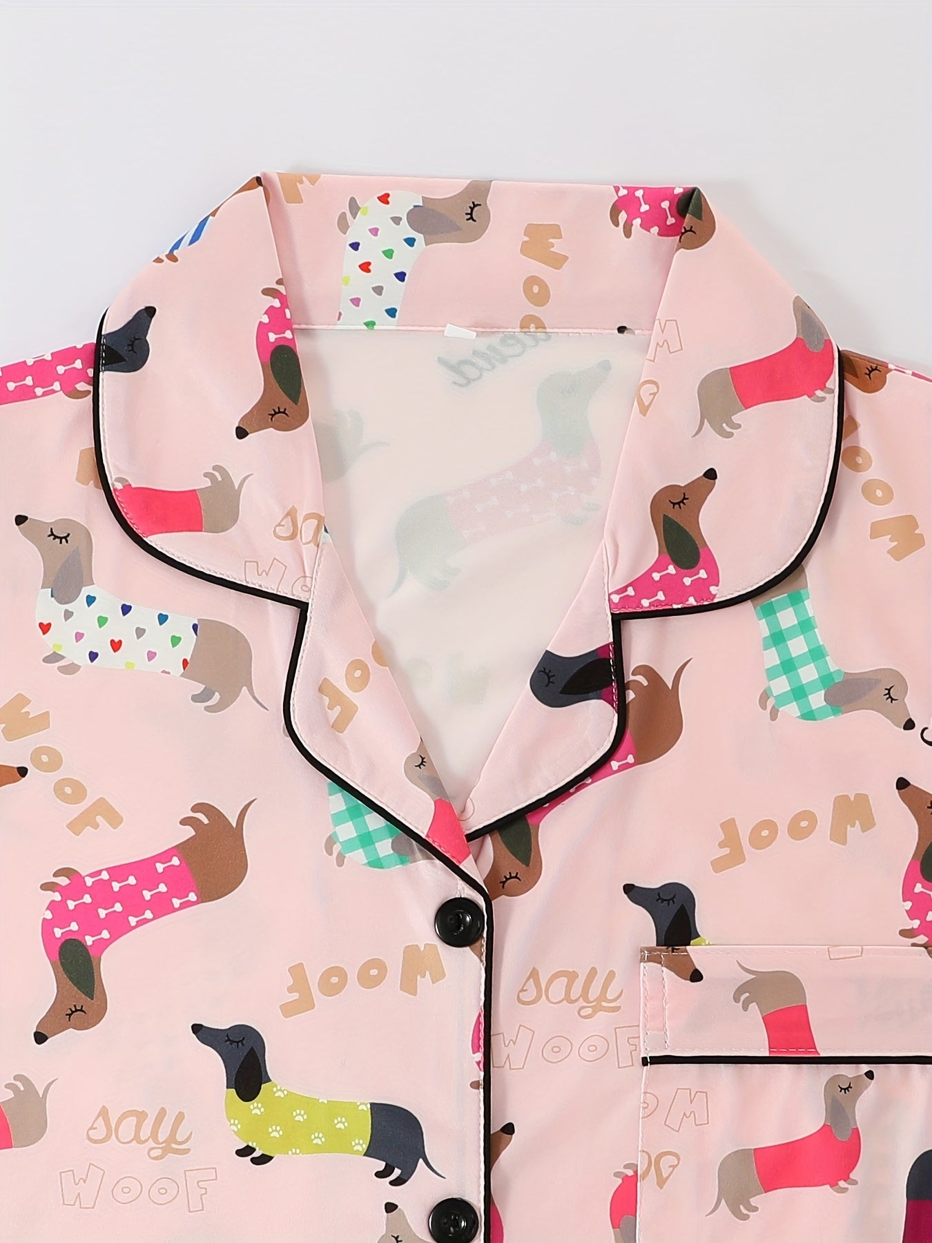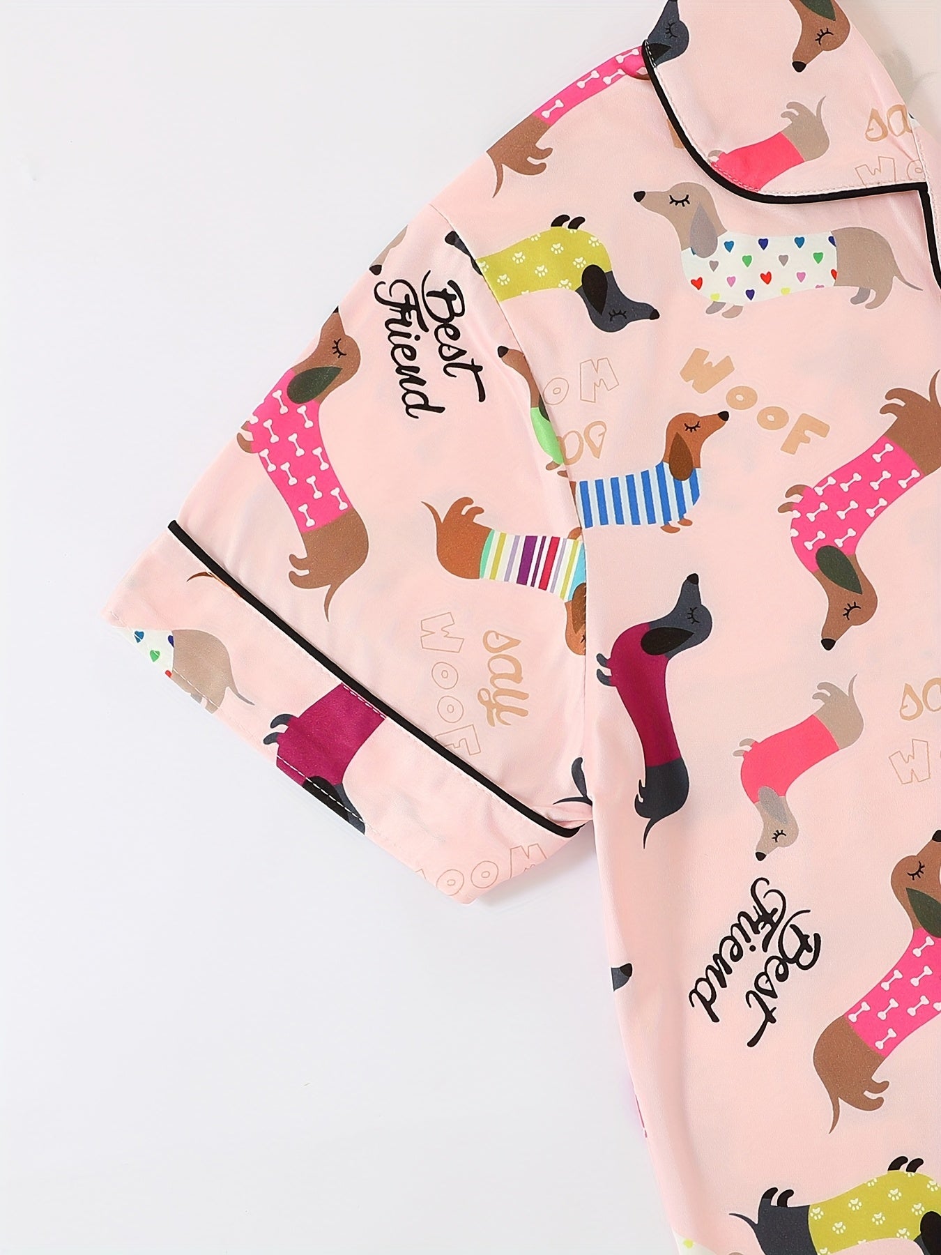 Step into cozy cuteness with this adorable satin nightwear set, featuring playful dachshund dog prints in colorful outfits with fun words like “Best Friend” and “Woof.” The soft satin fabric gives a silky-smooth feel, perfect for lounging in style or enjoying a restful night’s sleep.