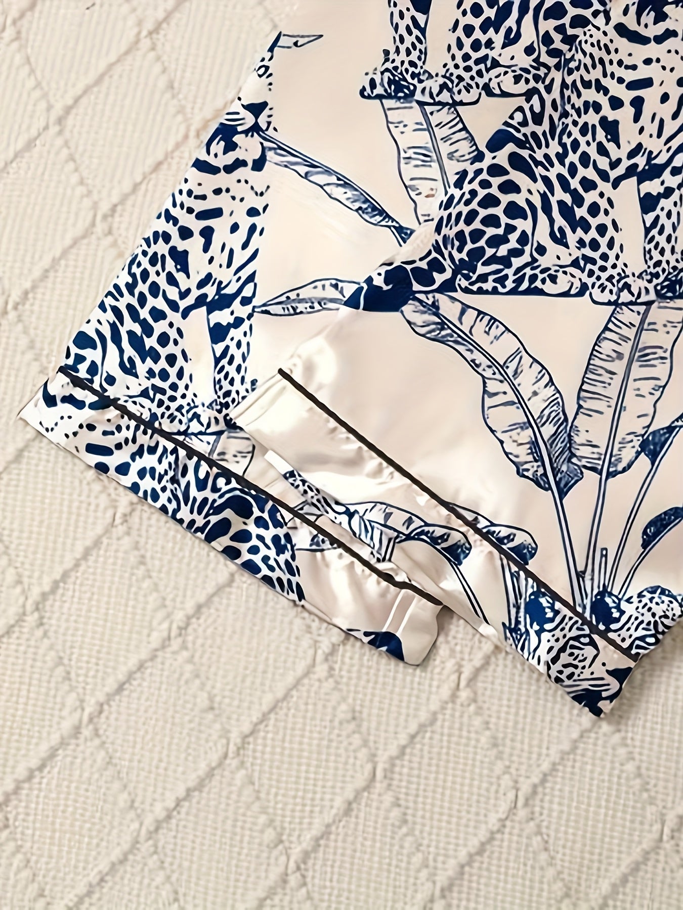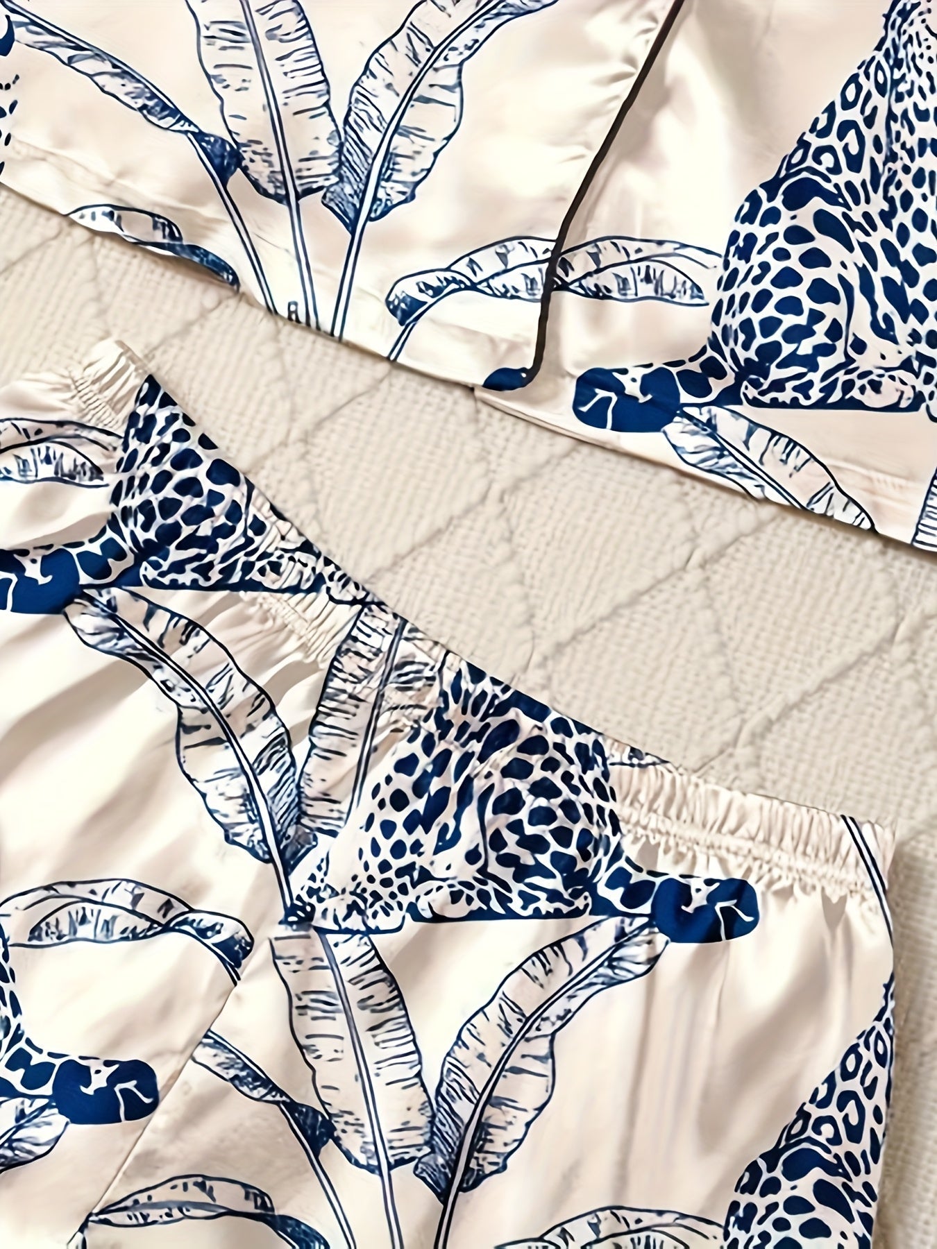 Add a touch of wild sophistication to your nights with this leopard-print 3-piece nightwear set, featuring a short-sleeve button-down shirt, elastic waist shorts, and full-length pajama pants. Designed on a soft beige base with detailed navy blue leopard and tropical leaf prints, this set brings both elegance and comfort to your loungewear.
