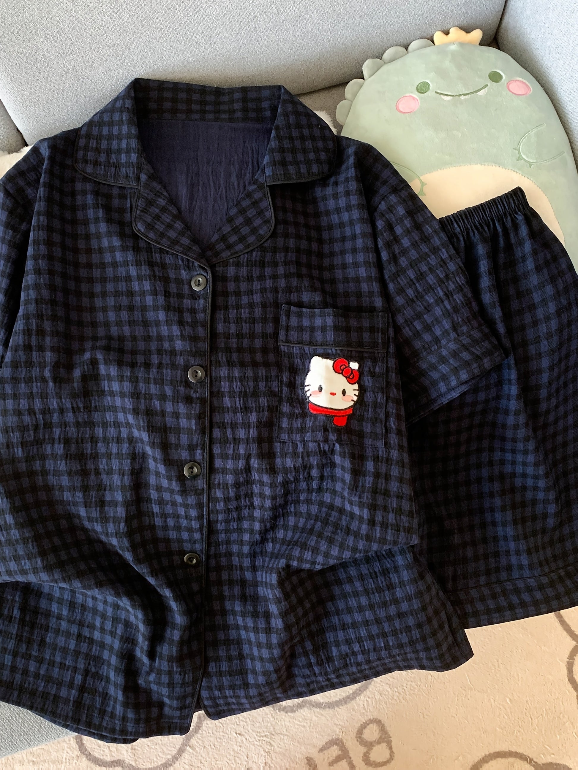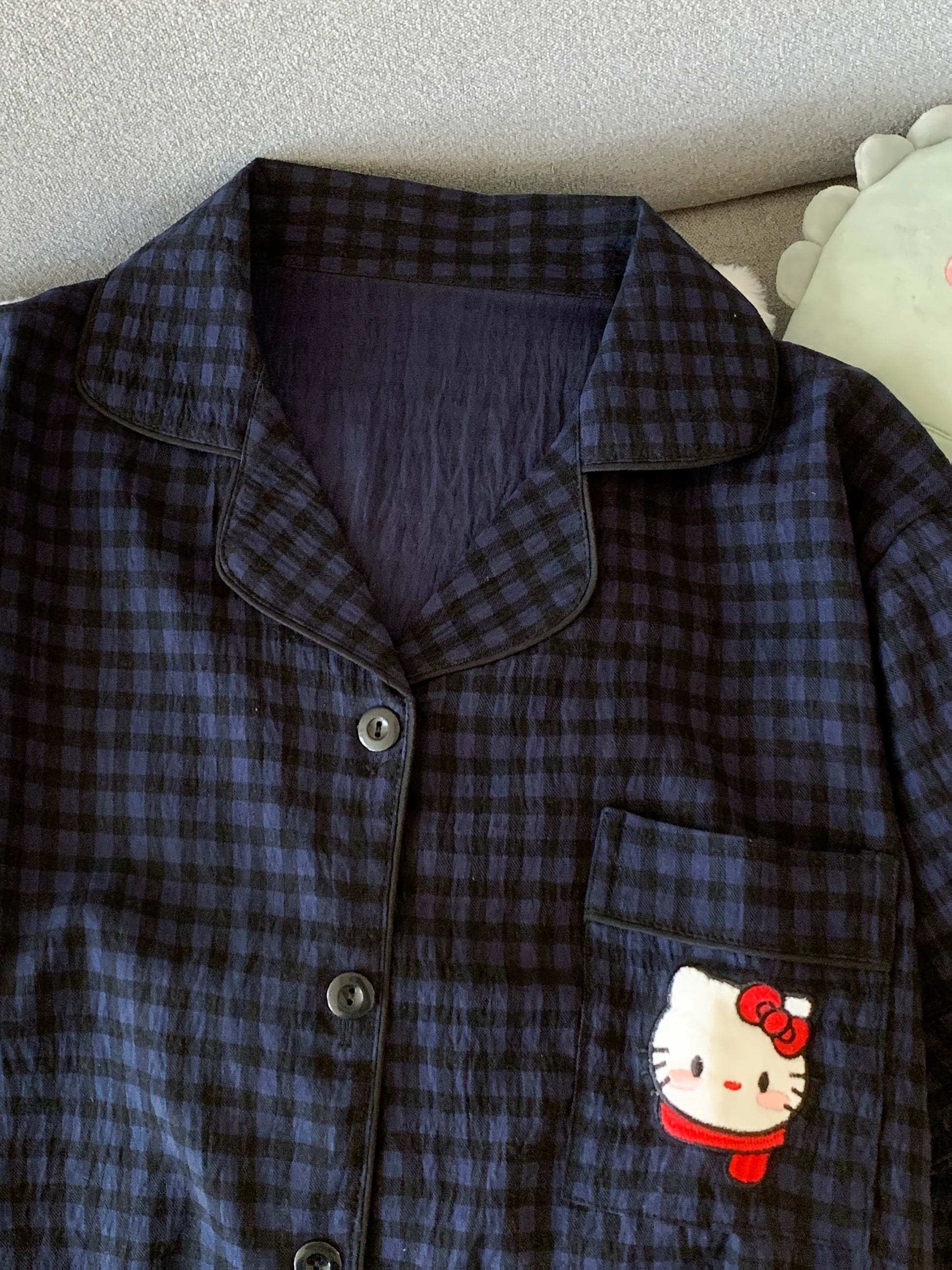 Stay cozy and stylish with this navy blue check pajama set featuring a cute Hello Kitty pocket detail. The set comes with a button-up short sleeve shirt and matching elastic waist shorts, designed for maximum comfort whether youβre sleeping or lounging.