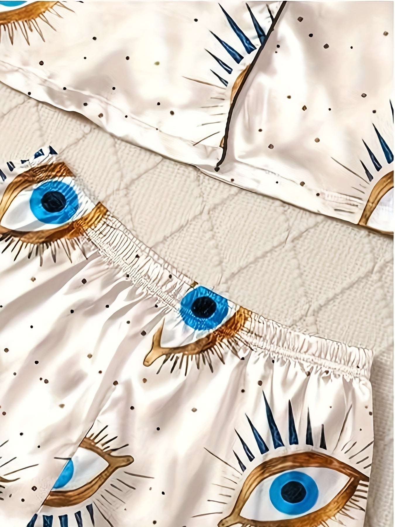 Add a touch of mystery to your nights with this eye-print 3-piece nightwear set, featuring a short-sleeve button-down shirt, elastic waist shorts, and full-length pajama pants. The cream base is decorated with striking blue and gold eye motifs with artistic lashes, giving a bold and unique vibe to your loungewear.