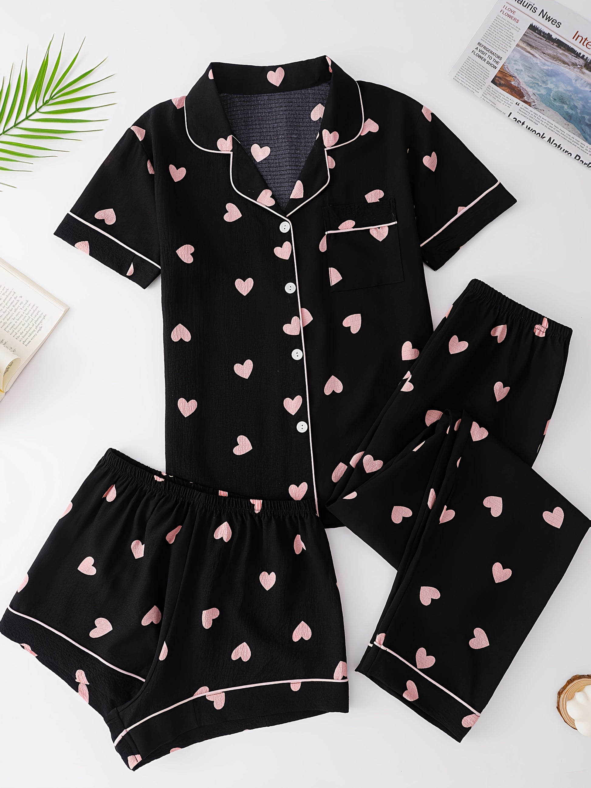 Fall in love with your nights in this black pajama set sprinkled with soft pink hearts. π Made from a lightweight, breathable fabric, itβs designed to keep you cozy while adding a touch of cuteness. The white piping details and classic button-down style make it effortlessly chic, while the matching shorts and pants give you the freedom to lounge your way.